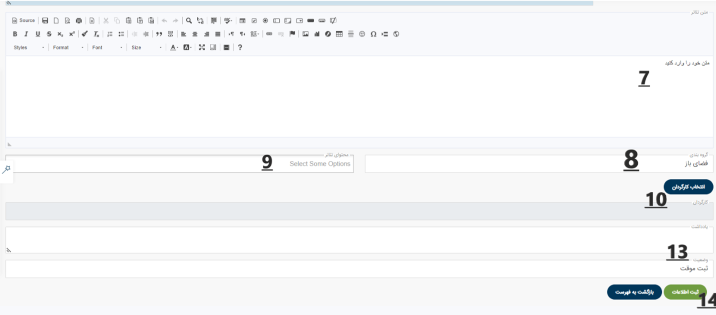 - در این قسمت محتوای تئاتر موردنظر اعم از خانوادگی، زندگی نامه و... را وارد کنید.